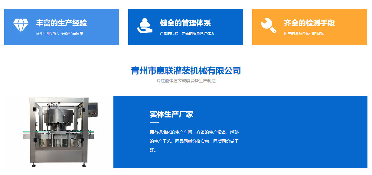 青州市惠聯灌裝機械有限公司是一家集生產研發、銷售、服務于一體的液體灌裝成套設備生產企業,可根據廠家要求設計合理液體灌裝生產線,為用戶提供技術咨詢、設計工藝、場區平面布置、工藝改造、設備安裝調試等完善服務。 公司生產制造各種類型液體灌裝機、過濾機,水處理設備及液體灌裝成套設備。主要產品有:白酒、葡萄酒、黃酒等酒水灌裝機、食用油、機油、潤滑油等油類灌裝機、醬油醋、老抽、生抽等調味品灌裝機、防凍液、玻璃水灌裝機、酒精、84消毒液灌裝機、車用尿素灌裝機、口服液灌裝機、洗滌劑灌裝機等多種液體、膏體灌裝設備,全自動/半自動灌裝機型號多,規格全,洗瓶機、瓶子封口機、打塞機、熱縮機、瓶子烘干機、貼標機、噴碼機、輸送線、裝箱機、水處理設備等全套生產線相關配套設備齊全,自產自銷,一站式購齊,售后無憂。